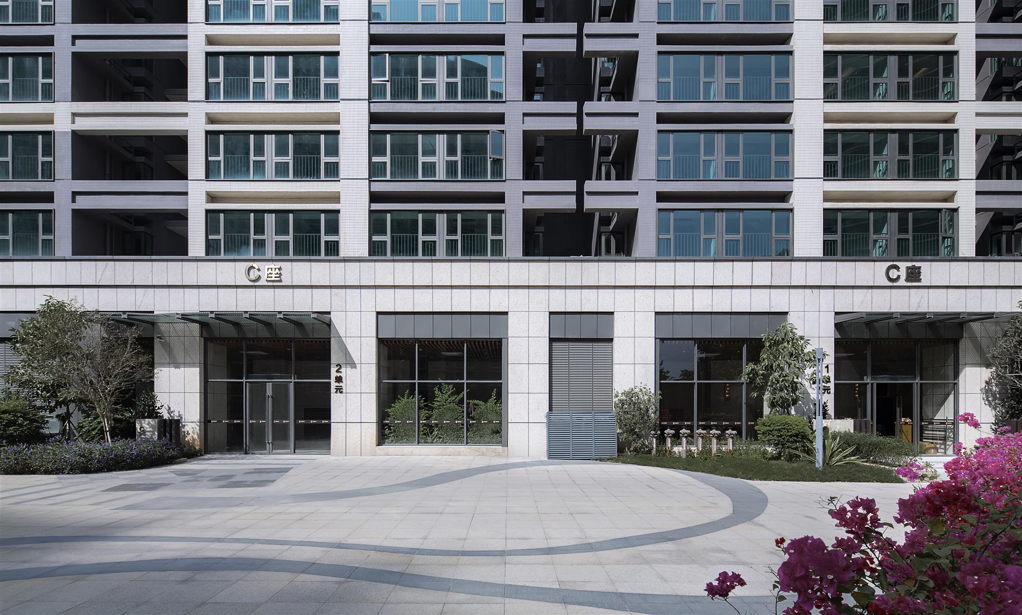塔楼外立面整齐挺拔,形体顶部、底部以及局部挑空,创造出波动的底层连续架空空间和顶部动感天际线。针对高容高密住区,设计团队充分利用小户型的凹槽设置空调及管线,通过立面线条控制凸窗高度,利用构造遮挡,避免室外挂机、管线外露,保证建筑立面整体性。