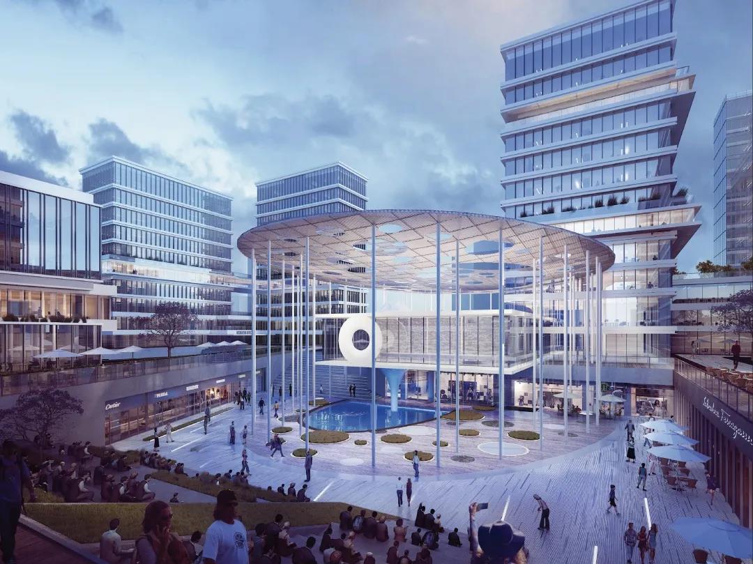 上海新金环广场设计竞赛方案将城市以及文化与生态融合,打造具有山水诗意的购物休闲空间,同时保留文化地标,并融合智慧办公与智创发展,标志着未来建筑所需要的“绿色智慧”。